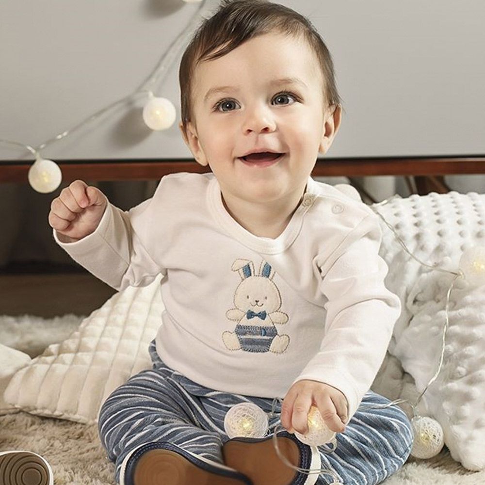 O coelhinho esta usando uma fraldinha azul com detalhe de um alfinete, a fraldinha é da mesma estampa da calça.