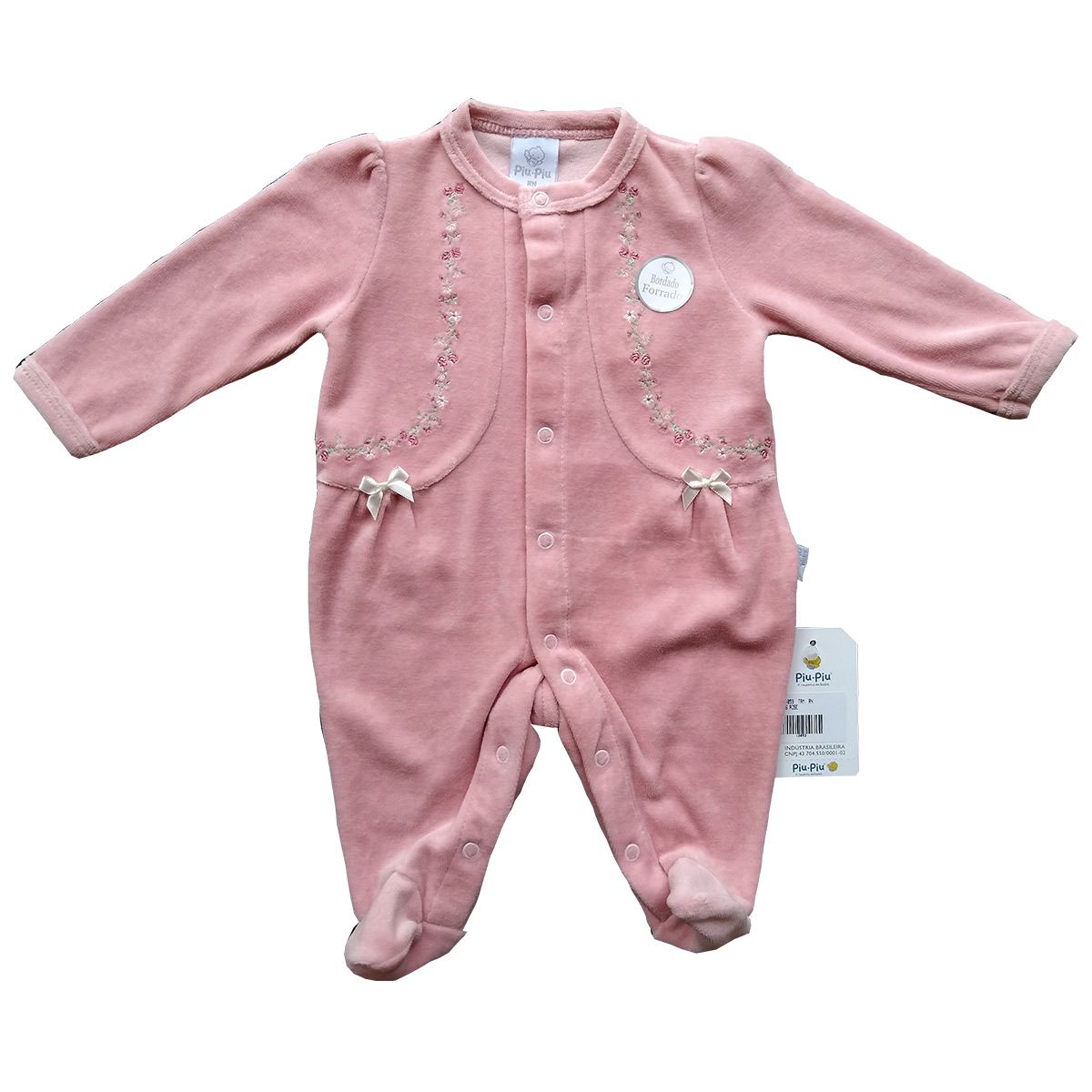 Macacão em Plush para Bebês com lindas Rosas Bordadas, além de dois lacinhos brancos na região peitoral do bebê.